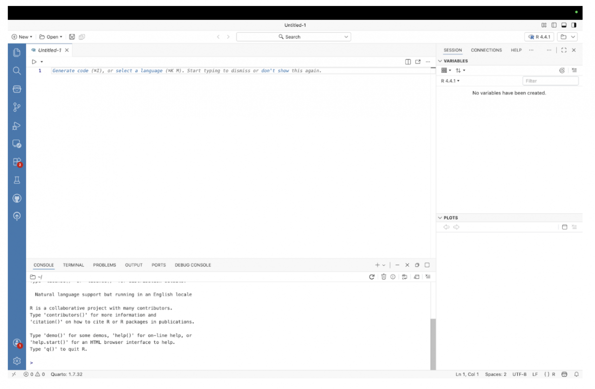 If you haven’t already, install R from the official R website. Once installed, open Positron and create a new R script. Positron works much like VS Code or other code editors with previews, but is especially useful for R and Python workflows.