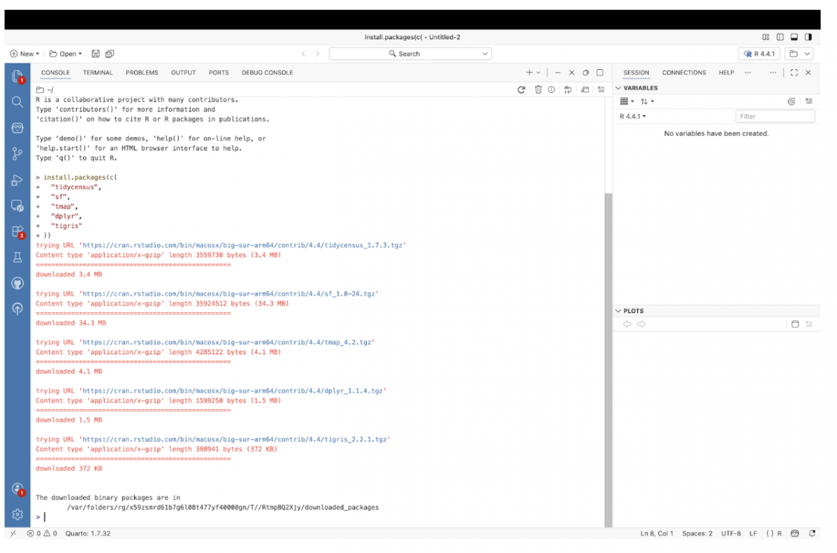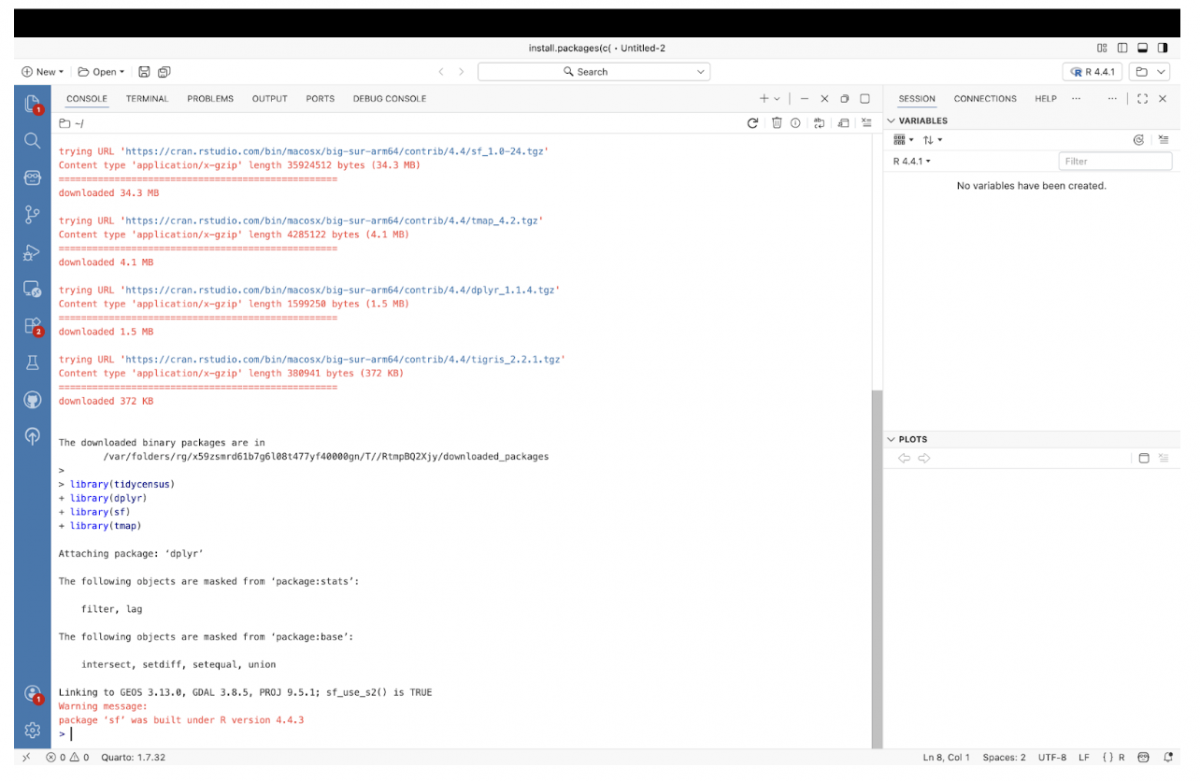In the Console, install the packages needed to pull Census data and create a map.