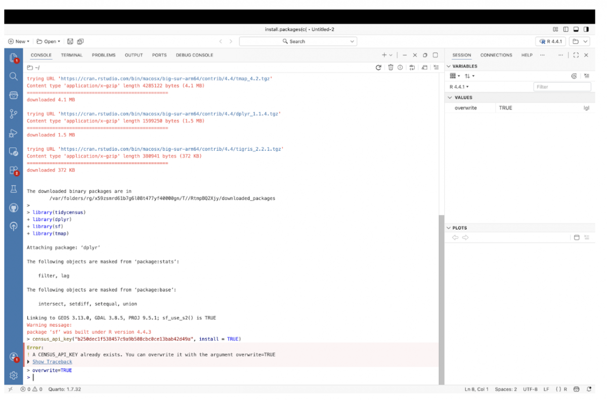 Throughout the process, I documented each step with screenshots, including moments where things did not immediately work as expected. That friction is part of the story. Restarting the R session after registering an API key, understanding where exported files are saved, and recognizing how spatial objects behave in R are all small details that matter when you are new to this workflow.
