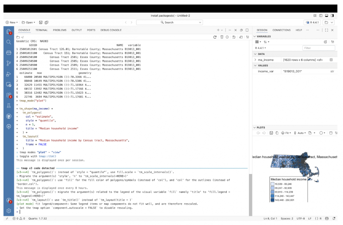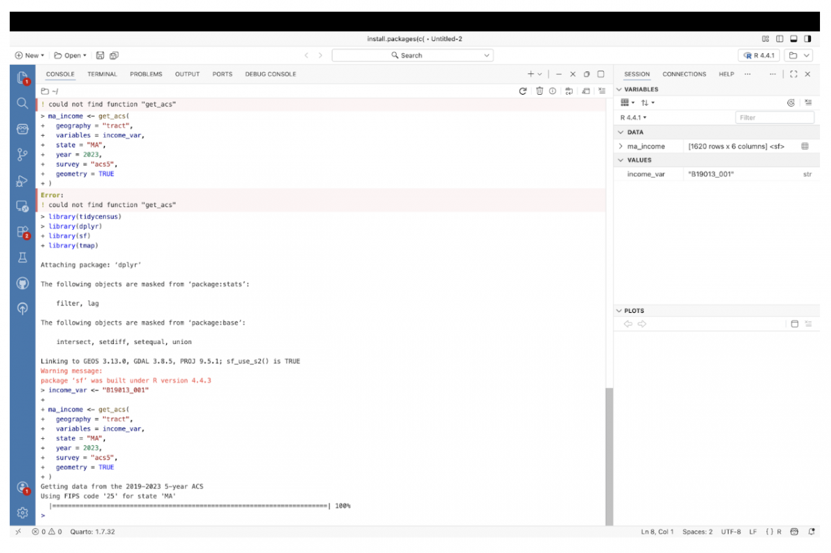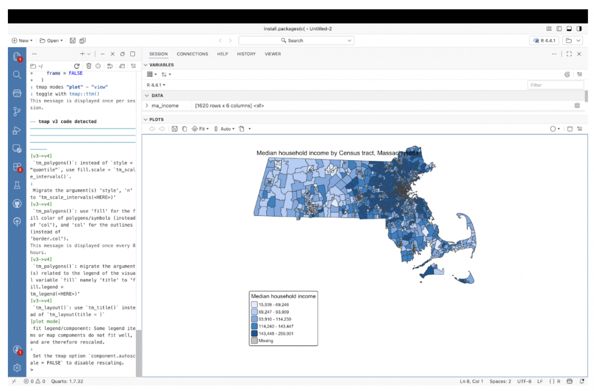 Inspired by a video explainer by Kyle Walker, this tutorial starts from a simpler place: a blank project in Positron and a single question. How quickly can you go from raw Census data to a usable map using R?
