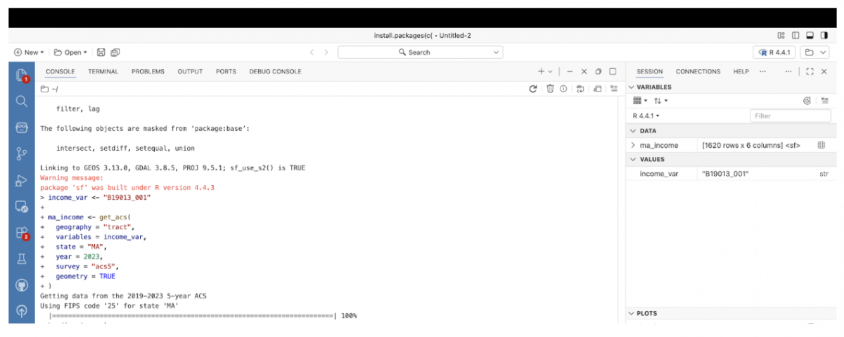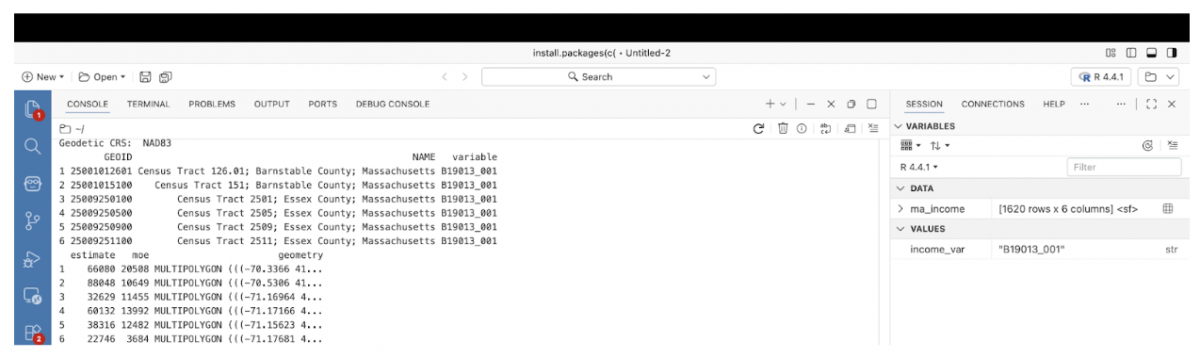 Using the tidycensus package, I pulled American Community Survey data at the census tract level, letting R handle both the data and the geography in one step. Instead of manually downloading shapefiles or opening a GIS interface, tract boundaries are included directly by setting geometry = TRUE. The result is a single spatial data object that can be inspected, mapped, and reused.