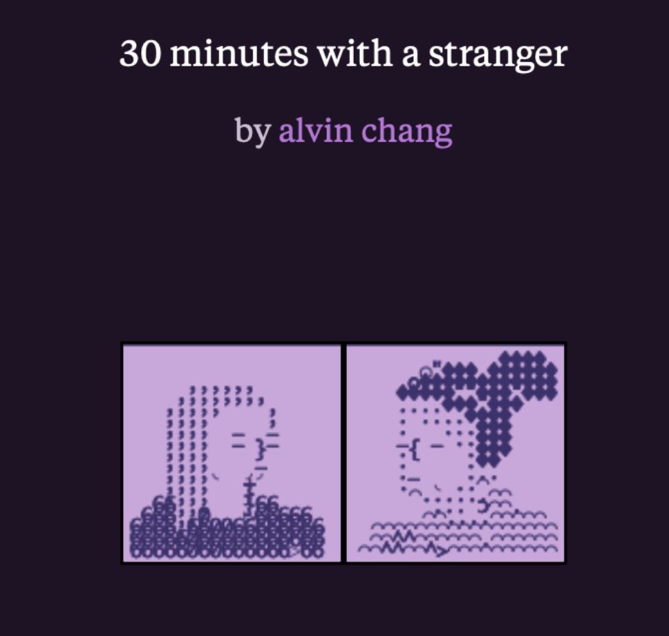 Alvin Chang is no stranger to visual storytelling. He has built his career on turning data sets into captivating, compelling tales for The Pudding, The Guardian, Vox and others. Chang’s past work often explores themes of community and human behavior, and his newest piece continues that trajectory. In “30 Minutes with a Stranger,” for The Pudding Chang explores the conversation of people who do not know each other, but by the end of a 30-minute interaction, form a platonic bond.