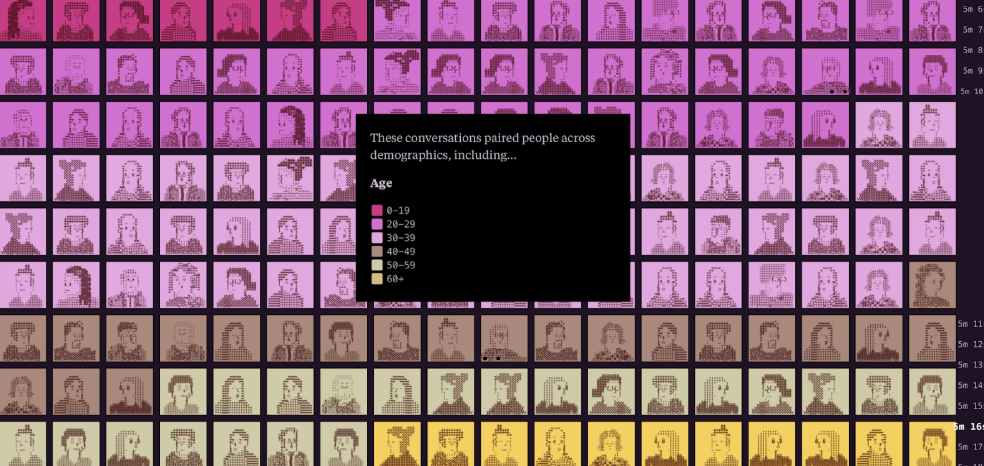 Using data from the CANDOR Corpus, a public dataset of over 1,600 conversations, he animated conversations and deduced findings from a subset of 1,700 participants. The findings, which he relates back to himself at the end, offer an optimistic view of humanity – especially in a time viewed as overly polarized.