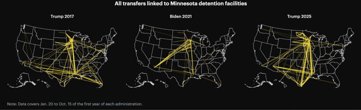 In late January, the Minnesota Star Tribune, where I’m a graphics producer, published “How immigration detainees are moved around Minnesota and the nation,” giving a detailed picture of ICE detentions during the first year of Trump’s second term.