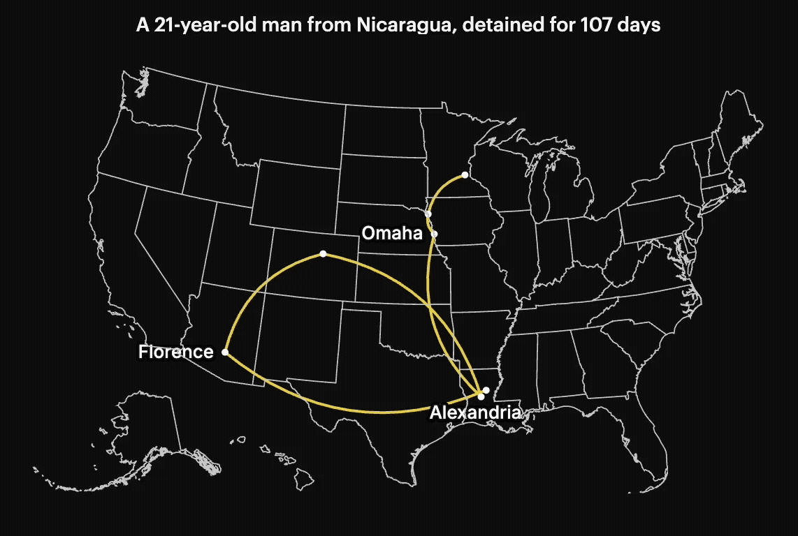 Susan Du helped find and interview people who were being affected by these detentions. We also identified individuals whose stories could be traced through the data. Some had no criminal record, yet were still moved across multiple states before deportation.